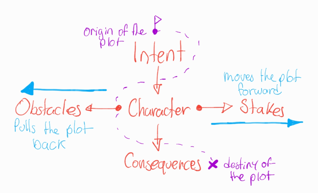 There are multiple ways to structure plots—but as I hope to convene during these essays, I tend to prefer simplicity, symmetry and versatility. My prefered structure summarises plots into four aspects affecting the actions of the actor(s) in a story; (1) intent, (2) consequences, (3) stakes, and (4) obstacles.